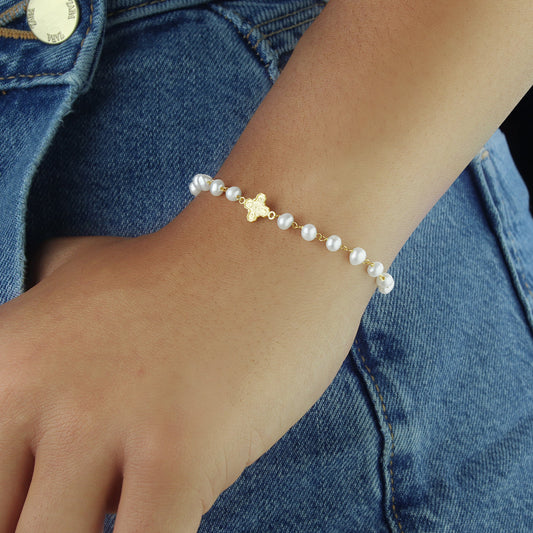 GIOVE MIO Pulsera de Cadena con Medalla de la Cruz de los Cuatro Caminos y Perlas en Oro Amarillo de 14Kt con Perlas Cultivadas de Aguadulce.
